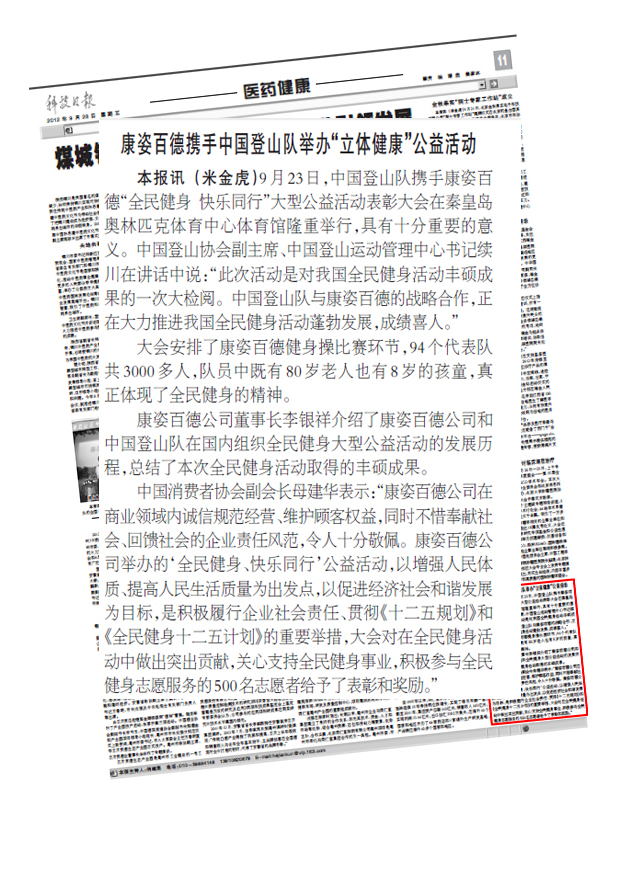 2012年9月28日《科技日報》在第十一版《醫(yī)藥健康》以《康姿百德攜手中國登山隊舉辦“立體健康”公益活動》為題,刊登了我司在秦皇島奧林匹克體育中心舉行“全民健身 快樂同行”大型公益活動表彰大會的盛況。 近年來,為貫徹全民健身實(shí)施綱要,推助全民健身運(yùn)動,康姿百德公司組織了一系列形式多樣、內(nèi)容豐富、健康文明的群體競賽公益活動,而且聲勢一年比一年高,規(guī)模一年比一年大。本次表彰大會共有5000余人參加,來自20多個省、市、自治區(qū)的94支代表隊參加健身操展演,展演人數(shù)達(dá)到3014人,受表彰健康大使500人。