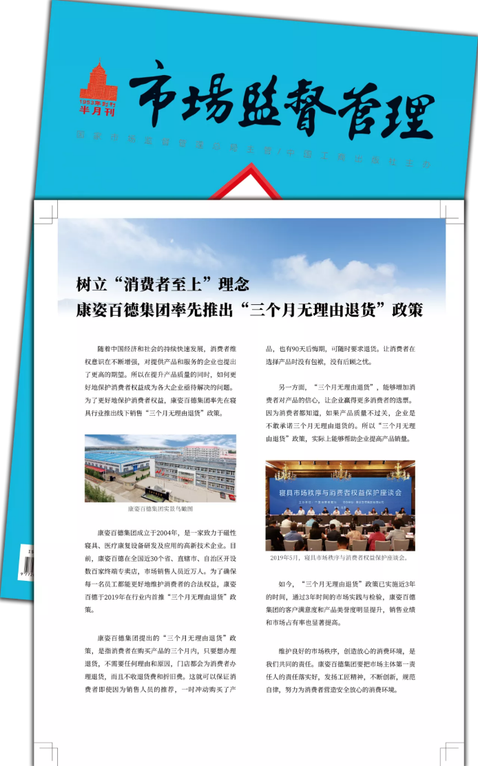 《中國市場監(jiān)管報》由國家市場監(jiān)督管理總局主管,是一張面向全國工商行政管理和市場監(jiān)管部門系統(tǒng)、廣大工商企業(yè)和消費者讀者的經(jīng)濟法制類報紙,是宣傳工商行政管理工作、詮釋工商行政管理法律法規(guī)的權威媒體??底税俚履軌驑s登《中國市場監(jiān)管報》,說明康姿百德在消費者維權方面所做出的突出貢獻,得到了社會各界的充分肯定,也贏得了廣大消費者的贊譽。