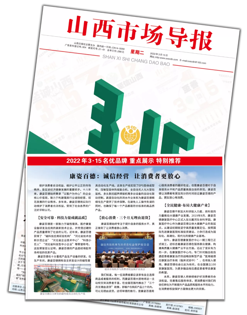 《山西市場導報》以“康姿百德:誠信經(jīng)營 讓消費者更放心”為主題對康姿百德的報道?!渡轿魇袌鰧蟆肥怯?/span>山西省工商行政管理局主管主辦的機關報。