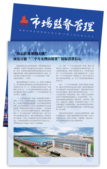 康姿百德在消費者維權(quán)方面,積極響應(yīng)國家市場監(jiān)督管理總局的號召,自主在行業(yè)內(nèi)推行“三個月無理由退貨”政策,并被先后刊登在《市場監(jiān)督管理》雜志上3次。